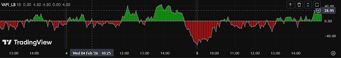 当 VAPI 与价格方向一致时(比如价格上涨,VAPI 也走高),说明这个方向有成交量的确认,信号可信度高。当 VAPI 与价格方向背离时(比如价格上涨,VAPI 却走低),说明这个信号可能有问题,需要谨慎。